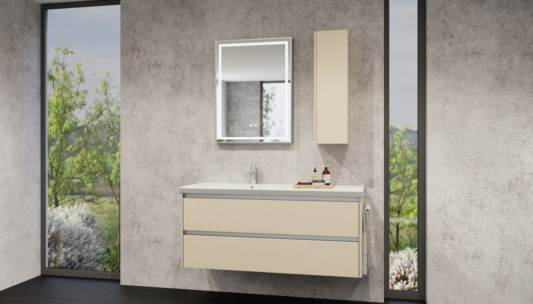 A letisztult, fogantyú nélküli frontok mellett visszafogott karaktert adnak a termékcsaládnak a finom élmegmunkálások. Praktikus kis ékszer lehet fürdőszobádban a Jana szett, aszimmetrikus változatát választva imádni fogod az extra rakodófelületet.