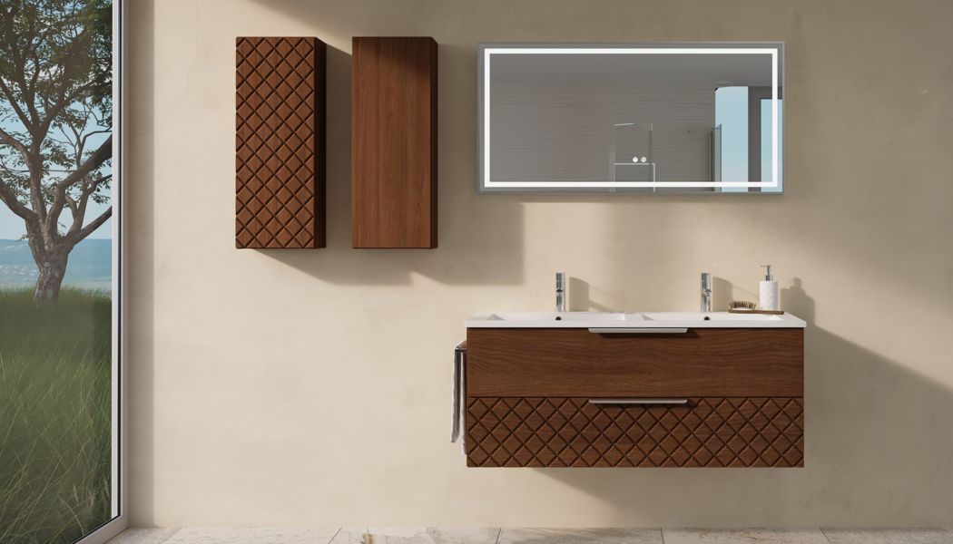 Tboss Quarto 120 AM mosdószekrény, Termék kód: QUAO120AM, 120×52×50 cm, 2 fiókos alsószekrény, 2 medencés mosdóval, fali rögzítéssel, többféle fogantyúval és törölközőtartóval.